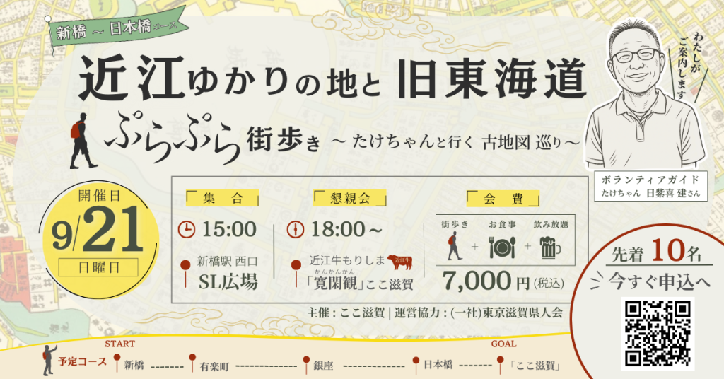2025年9月21日(日)の15時より、「近江ゆかりの地と旧東海道 ぷらぷら街歩き―たけちゃんと行く古地図巡り―」を開催します。